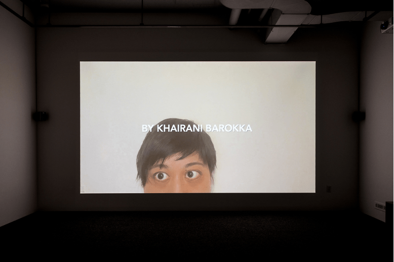 Gallery view. A large projected film still of the clip Dust Prayer on a gallery wall in a darkened room. The film still shows the face of an Indonesian woman looking into the camera, and white text which says ‘by Khairani Barokka.’ in the centre of the screen.