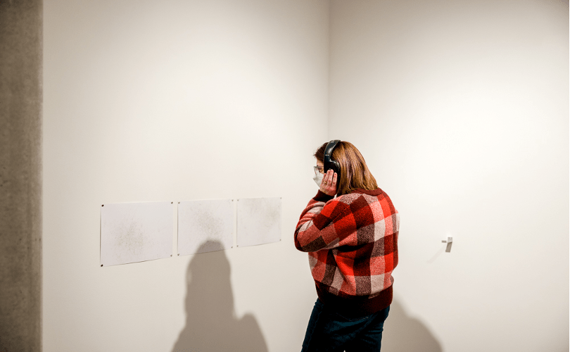 A person wearing a checkered sweater and headphones stands in front of three drawings, which are hung side-by-side on a white wall.