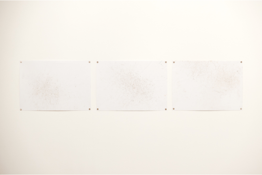 A series of three drawings hung horizontally on a white wall. The drawings depict a variety of small and soft markings.