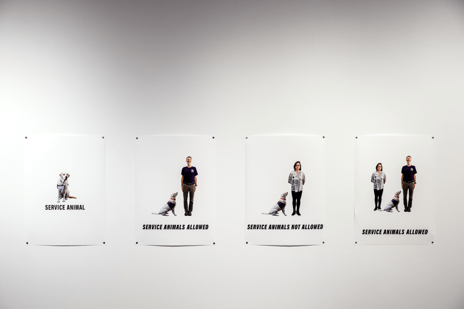Gallery view of artwork by Fran Flaherty. Four prints hung on a white wall. The leftmost picture depicts a photograph of a dog with the words ‘Service Animal’ written underneath on a white background. The picture adjacent depicts a photograph of a dog sitting beside a standing man. The words ‘Service Animals Allowed’ is written underneath. The next picture adjacent depicts a photograph of a dog sitting beside a standing woman. The words ‘Service Animals Not Allowed’ is written underneath. The rightmost picture depicts a photograph of a dog sitting beside a standing man and woman with the words ‘Service Animals Allowed’ written underneath.