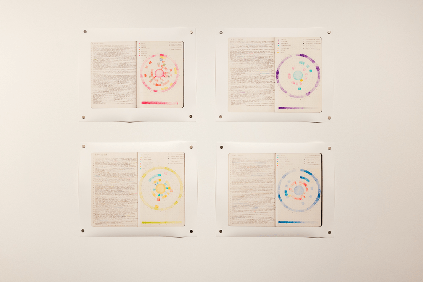 4 photographs of journal pages written by Yo-Yo Lin, hung on a white wall. Each photograph of the journal pages shows a journal entry, alongside a colorful drawing of a circular visualization.